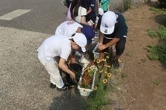 「学校の門からの道にお花を植えたらどうかなあ」 1年生の児童が、ある日、そんなつぶやきをしました。 地域の方からのお気持ちをいただき、お花の苗をたくさん購入しました。7月3日の朝、全校の子供たちがプランターに苗植えをしました。お花は、日々草とベゴニアそれぞれ1本ずつです。 花の色は自分で選びました。「ピンクがいいかなあ。白もいいね」などと、自分のお花を選んで、やさしく植えていました。