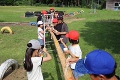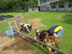 そうめん流しに使った樋(とい)をすぐに撤去してはもったいない! ということで、恒例の「〇〇流し」を開催しました。朝学活の時間に希望する子が集まって行いました。 丸いもの、転がりそうなものを色々集めて、割りばしでキャッチして楽しみます。