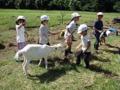 休み時間になり、「お散歩させたい!」と、リードを持った子供たち。「えさをあげたい!」「頭を撫でたい!」「一緒に走ってみたい!」と、やりたいことがいっぱいです。 思わぬ所でフンをして、驚く場面もありましたが、「ほうき、ほうき」と、急いで片付けていました。 「0歳のヤギと比べたら、みんなはお兄さん・お姉さんだから、優しくお世話してあげてね」と、荻谷畜産の方から託された命です。大変な時でも、皆で力を合わせて頑張ってくれることでしょう。