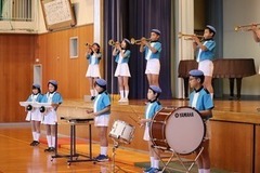 高学年は、トランペット鼓隊の演奏です。 曲目は「こんにちはトランペット」と「谷浜小学校校歌」2曲。 春の演奏は「こんにちはトランペット」1曲でしたが、2学期から練習を始め、校歌も演奏できるようになりました。トランペットで高音を出すのが困難だったり、太鼓のリズムと合わなくなってきたりして、苦労していましたが、本番は一番いい演奏ができました。指揮者に合わせて息の合った演奏ができ、会場からも大きな拍手をいただきました。
